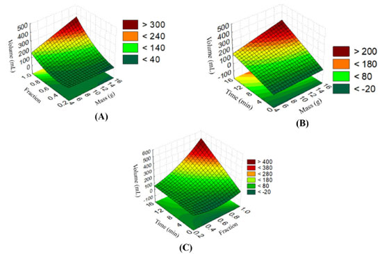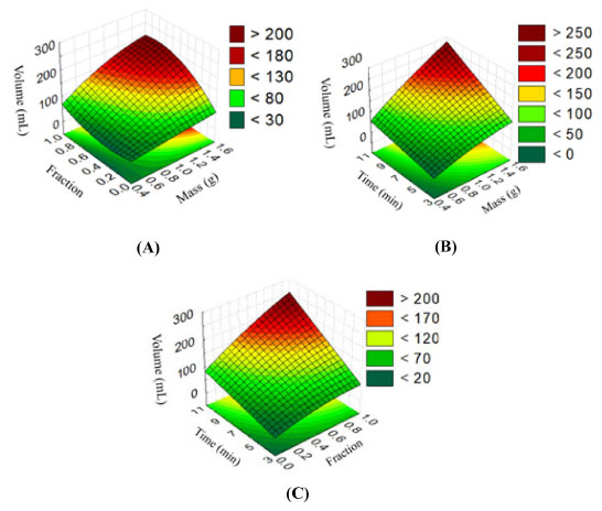 ![]() Figure 4. Response surfaces for iron powder between (A) fraction and mass, (B) mass and time, and (C) fraction and time