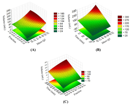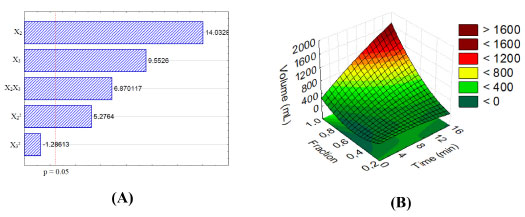 By analyzing the response surface of the fraction over time, Figure 9B shows that the increase of these variables has a positive influence on the response. Table 7 was also obtained, with the maximum observed and minimum observed points and the critical point calculated by the software.