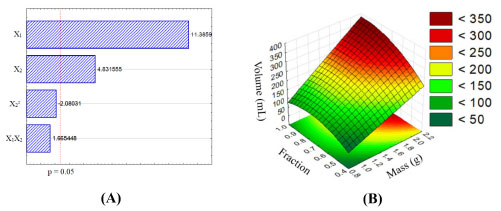From the Pareto graph obtained (Figure 11A) it can be observed that the linear term of time is more significant. Quadratic fraction (X22), linear mass (X1), linear fraction (X2) and the interaction between linear fraction and linear time (X2X3) are also quite significant. However, the quadratic time and quadratic mass in the 95% confidence interval were not significant. From the residuals graph (Figure 5S B) it was observed that the points are situated randomly around zero, which proves that the model is appropriate for the data, as no trend is observed.