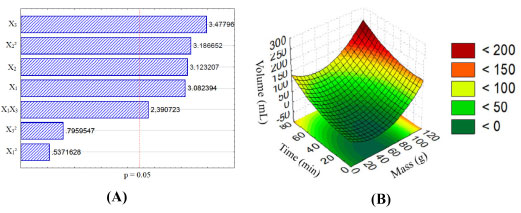 ![]() Figure 9. Results for OCCD experimental design with iron powder: (A) Pareto graph, and (B) response surface for acid fraction vs. mass