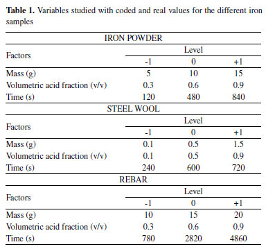 Factorial design Adequate experimental design requires that the experiment provides the required information. It is necessary to quantitatively evaluate the influence on the response variables and the interactions between the factors. For this, a complete factorial design can be used, which permits the elaboration of a minimum of experiments, improving the quality of the information obtained.13 Data were analyzed through a factorial design 33 (three levels and three variables) for each material. The experimental matrix was generated by the Statistica® software (license from PMPIT - ICTE - UFTM). The independent variables analyzed were mass (X1), volumetric acid fraction (H2SiF6/HCl) - When the acid fraction tends to 1, H2SiF6 is present at 100% - (X2) and time (X3), being the volume of gas obtained the response variable. The coded levels and actual values of each variable are presented in Table 1. Assays were performed in triplicate.