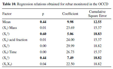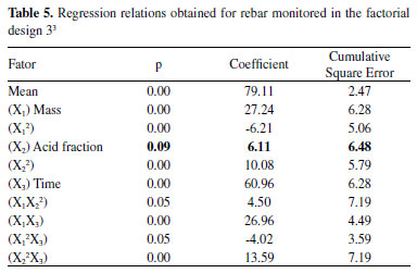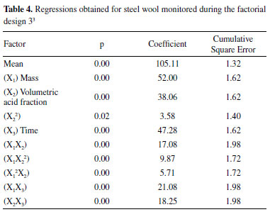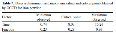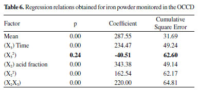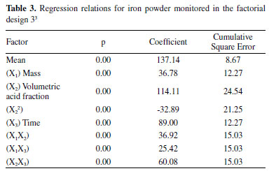 RESULTS AND DISCUSSION Factorial design Iron powder Table 3 presents the values obtained for the parameter p, as well as the values of the coefficients and the accumulated square error for iron powder (R2 of 0.9654). For a more refined analysis, the statistically non-significant terms were eliminated, with the quadratic term of mass (X12) and quadratic time (X32) being removed.