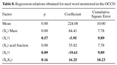 The critical value provided was expected to be the optimal process point, however, the critical value presented is a cell point and not the highest production point. Thus, due to the physical limitations of the experiment, the maximum gas production point for the process is the maximum value observed with the fraction of 0.96 and time of 15.26 minutes. The oxidation of iron and by consequence the H2 production can be decreased due to characteristics of the waste (such as the presence of inhibitors or contaminants metals), however this parameter was not evaluated in present study.35 Steel wool n°2 Table 8 presents the values of P, coefficient, and accumulated error for steel wool. The interaction of X1 (mass) and X2 (acid fraction) was not significant even though a positive response was observed. However, the effects of X12 (quadratic mass), X22 (quadratic fraction) and X1X2 (mass and fraction) were maintained in the model.