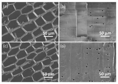 ![]() Figure 1. FESEM images of balsa slices. (a) transverse section and (c) longitudinal section of the pristine slice, (c) transverse section and (d) longitudinal section of the pristine slice, (c) transverse section and (d) longitudinal section of the treated slice