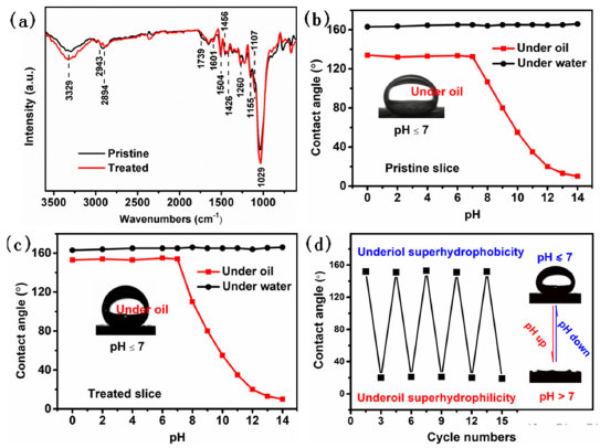 ![]() Figure 2. The pH-responsive wettability of the balsa wood slice. (a) The FTIR spectra of the slice before and after treatment. (b, c)The variations of underoil (kerosene) water contact angles with water pH for the pristine and treated slice. (d) Reversible water wettability of the treated slice switched between underoil superhydrophobicity and underoil superhydrophilicity by altering water pH