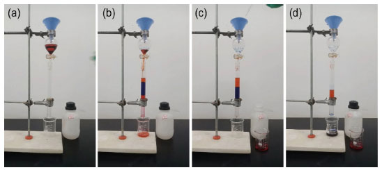 ![]() Figure 3. Photographs of continuous separation process of a light oil/water/heavy oil triphase mixture. (a) Prewetting the slice with heavy oil, a triphase mixture of kerosene/acidic or neutral water/chloroform flowed into the upper tube through a dropping funnel. (b) Chloroform permeated the slice into a beaker while the acidic or neutral water was rejected on the slice. (c) After regulating the pH value from acidic or neutral to basic, the basic water layer passed through the slice. (d) The upper oil layer was retained in the upper tube. Two oil layers were colored by oil red and water layer was dyed with methylene blue