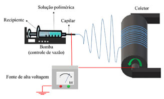 ![]() Figura 1. Representação esquemática do arranjo experimental para eletrofiação. Adaptado da Ref. 222. Copyright 2019, com permissão da Springer