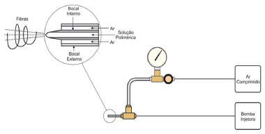 ![]() Figura 2. Aparato experimental para produzir fibras poliméricas com fiação por sopro em solução (Fonte: Paschoalin, 2017)235