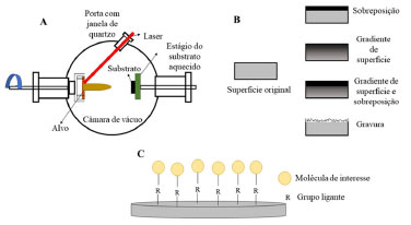 ![]() Figura 3. Representação esquemática da modificação de superfície (A) utilizando deposição por laser pulsado. Adaptado de Bellardita et al.;252 (B) utilizando diferentes métodos de tratamento com plasma. Adaptado de Chu et al.;253 e (C) por imobilização covalente