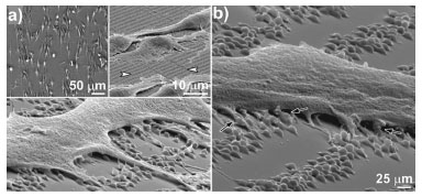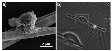![]() Figura 8. Interação celular com diferentes biomateriais: a, b) Célula dendrítica aderida à nanofibra de PLA obtida por fiação por sopro em solução. Destaque para a motilidade induzida pela direção da fibra. Reproduzido da Ref.123 Copyright 2020, com permissão da Elsevier
