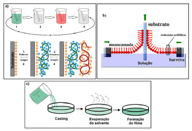 ![]() Figura 5. Representação esquemática da produção de filmes com as técnicas de: a) automontagem por adsorção física (Adaptado de Decher, 1997);267 b) Langmuir-Blodgett (Adaptado de Braunger et al., 2018);268 c) solvent-casting