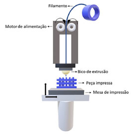 ![]() Figura 6. Representação esquemática de uma impressora 3D por modelagem por fusão e deposição