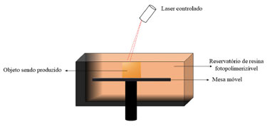 ![]() Figura 7. Representação esquemática do sistema de impressão 3D por estereolitografia, um sistema ascendente com varredura a laser. Adaptado de Melchels et al.283