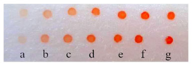 ![]() Figure 3. Image of the WBs obtained after the procedures of iron uptake (at different concentrations) and formation of the complex Fe(II)-phenanthroline. Iron concentrations used in the uptake procedure: (a) 0; (b) 0.05; (c) 0.1; (d) 0.15; (e) 0.2; (f) 0.25; (g) 0.3 mg L-1