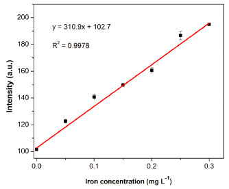 ![]() Figure 4. Calibration curve for the colorimetric detection of iron using WB. Error bars represent the standard deviation value for (n = 3) different images of the same WBs