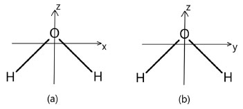 ![]() Figure 1. The two possibilities to label the water plane: (a) the molecule is in the xz plane; (b) the x axis is perpendicular to the plane of the molecule