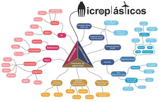 ![]() Figura 2. Panorama das possibilidades de um método analítico para a determinação de microplásticos no ambiente, considerando amostragem do compartimento ambiental de interesse, preparo de amostras e caracterização