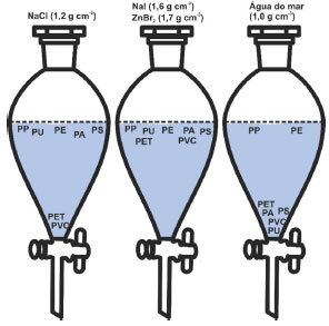 ![]() Figura 3. Separação por densidade contendo microplásticos de diferentes composições poliméricas utilizando as principais soluções salinas saturadas (NaCl, NaI, ZnBr2) e água do mar