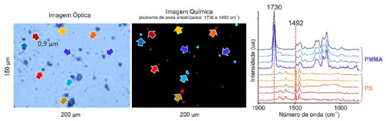 ![]() Figura 4. Imagem óptica, imagem química infravermelho (IR) e espectros das partículas indicadas pelas setas, adquiridas utilizando espectroscopia fototérmica no IR. Os dados são uma cortesia do fabricante do instrumento mIRage da empresa Photothermal Spectroscopy Corp