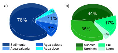 Ao todo, foram considerados 80 trabalhos, dos quais 61 referem-se aos estudos na matriz sedimento (incluindo areia de praia) e 19 na matriz água. Nenhum trabalho sobre MP na atmosfera e no solo foi encontrado no Brasil, considerando o método de busca de publicações empregado neste processo de revisão. Dos 19 trabalhos sobre a matriz água, 7 referem-se à água salobra, 9 à água salgada e 3 à água doce, conforme mostra a Figura 5a. Os ecossistemas marinhos foram de forma geral, os mais estudados quando comparados aos sistemas de água doce. Embora esses últimos sejam considerados como as maiores fontes de aporte dos resíduos plásticos para os oceanos, apenas recentemente vêm recebendo mais atenção da comunidade científica. Do total de trabalhos selecionados nesta revisão, apenas 8% avaliaram a presença de MP em ecossistemas (água/sedimento) de águas doces, enquanto 92% foram realizados nos oceanos e regiões costeiras (incluindo os sistemas de água salobra). Considerando a abrangência dos estudos ao longo de todo o território brasileiro, 44% das amostragens foram realizadas na região sudeste, seguido pela região nordeste (35%), sul (17%) e norte (4%), como pode ser visualizado na Figura 5b.