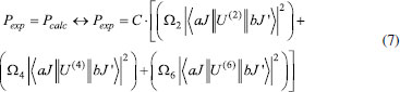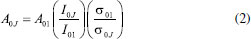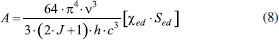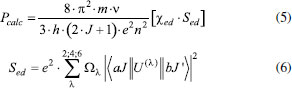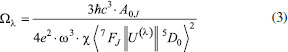 A força do oscilador de uma dada transição é obtida experimentalmente pela equação 4. ![]() em que m e e são a massa e a carga elementar do elétron, respectivamente, c é a velocidade da luz, N é a densidade de íons lantanídeos (íon cm-3) e ∫α(ν)dν é a área integrada da transição em um espectro do coeficiente de absorção (α/cm-1) versus frequência (ν/s-1). A força desse oscilador pode também ser obtida teoricamente a partir da equação 5, negligenciando a contribuição de transições que ocorrem pelo mecanismo de dipolo magnético. Nessa equação, ν é a frequência da transição, h é a constante de Plank, J é o número quântico de momento angular total inicial e Sed, dado pela equação 6, é a força da transição, em que o termo ![]() Para cada um dos valores experimentais haverá um correspondente teórico, dessa forma, através da relação obtida na equação 7, os valores dos parâmetros de intensidade poderão ser obtidos por um sistema de equações. Na equação, a constante C é dada por ![]() A partir dos parâmetros de intensidade, outros parâmetros espectroscópicos podem ser calculados, como taxa radiativa (Arad) e não radiativa (Anrad) de energia, e eficiência quântica (η). A expressão que determina Arad é a descrita pela equação 8. ![]() Nas equações 9 e 10, temos a relação entre as taxas radiativas de energia e o tempo de vida do estado emissor (τ) e eficiência quântica (η). ![]() Os parâmetros de Judd-Ofelt obtidos para os compostos de coordenação sintetizados estão dispostos na Tabela 1.