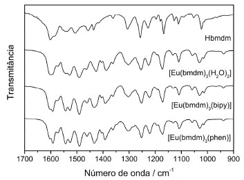 ![]() Figura 1. Espectro vibracional de absorção na região do infravermelho, de 1700 a 900 cm-1, do ligante Hbmdm e complexos tris beta-dicetonados de európio