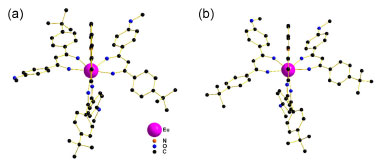 ![]() Figura 2. Geometrias do estado fundamental dos compostos (a) [Eu(bmdm)3(phen)] e (b) [Eu(bmbm)3(bipy)]