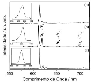 ![]() Figura 3. Espectros de emissão dos compostos [Eu(bmdm)3(H2O)2] (a), [Eu(bmdm)3(bipy)] (b) e [Eu(bmdm)3(phen)] (c), obtidos a ~77 K. Em destaque transição 5D0→7F0