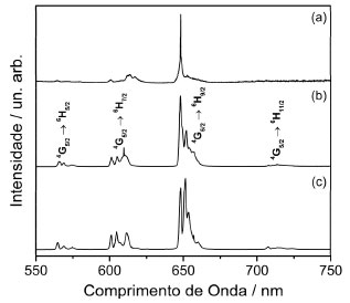 ![]() Figura 4. Espectros de emissão dos compostos [Sm(bmdm)3(H2O)2] (a), [Sm(bmdm)3(bipy)] (b) e [Sm(bmdm)3(phen)] (c), obtidos a ~77 K