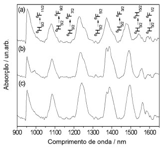 ![]() Figura 5. Espectros de absorção dos complexos (a) [Sm(bmdm)3(H2O)2], (b) [Sm(bmdm)3(phen)] e (c) [Sm(bmdm)3(bipy)]