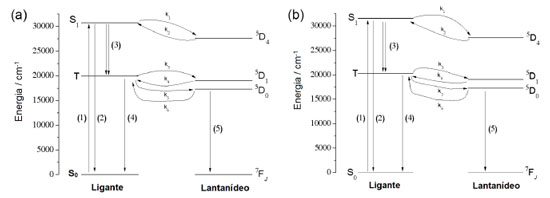 ![]() Figura 6. Posição dos níveis singleto fundamental (S0), singleto excitado (S1), tripleto (T), 5D4, 5D1 e 5D0. As flechas representam os fenômenos de transferência de energia para (a) [Eu(bmdm)3(phen)] e (b) [Eu(bmdm)3(bipy)]