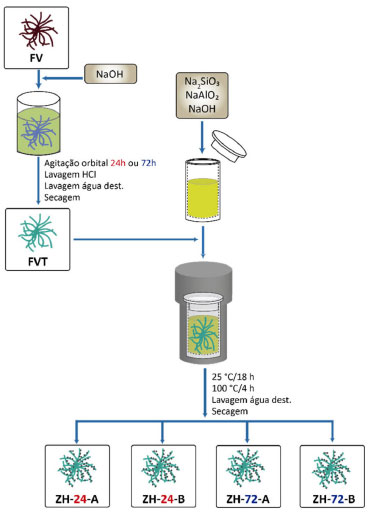 ![]() Figura 1. Representação simplificada dos procedimentos para a preparação das zeólitas hierárquicas