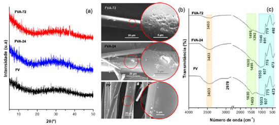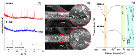![]() Figura 3. Caracterização dos materiais contendo a zeólita A, após 24h de tratamento alcalino da fibra de vidro: (a) DRX, (b) MEV e (c) IV