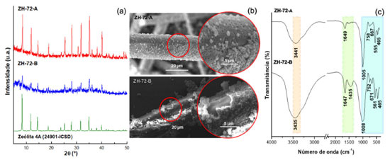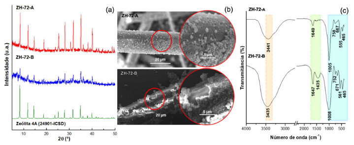 ![]() Figura 4. Caracterização dos materiais contendo zeólita A, após 72h de tratamento alcalino da fibra de vidro: (a) DRX, (b) MEV e (c) IV