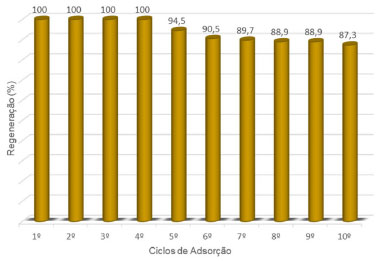 Considerando-se os resultados apresentados na Figura 5, a capacidade de remoção para íons Ca2+ é estimada em 10 mg por g de material zeolítico. Como aproximadamente metade da massa do material zeolítico é de fato a zeólita A, conforme previsto nas análises de fluorescência de raios X, a capacidade de remoção para íons Ca2+ se aproxima de 20 mg por g de zeólita. Esse valor é um pouco abaixo dos valores observados em outros trabalhos que fizeram uso da zeólita A na forma de pó,27-30 o que de certo modo é esperado já que os cristais zeolíticos dos materiais aqui apresentados se encontram integrados à superfície da fibra de vidro e portanto têm parte da sua superfície inacessível. Contudo, a praticidade advinda da possibilidade de se usar um sistema em fluxo pode compensar essa diferença. Outra propriedade importante para um agente de abrandamento é sua capacidade de regeneração e reuso. Nesse sentido, foram realizados ensaios de regeneração percolando-se uma solução Na+ (1000,0 mg L-1) através da coluna contendo o material zeolítico. É sabido que soluções com alta concentração deste íon (cerca de 10× a concentração de Ca2+) apresenta potencial para substituir os íons Ca2+ então retidos na estrutura da zeólita, reativando-a para o processo de abrandamento.31 A Figura 6 mostra a eficiência de regeneração e reuso da coluna em alíquotas de 20,0 mL da solução de Ca2+ 100,0 mg L-1, usando 500,0 mg do material zeolítico, em sucessivos ciclos.