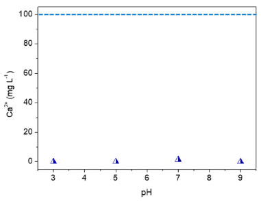 A avaliação do efeito do pH sobre a eficiência da amostra de zeólita hierárquica mostra-se relevante considerando as diferentes condições encontradas para amostras reais, notadamente águas de poço que se apresentam em uma faixa ampla de pH.32 A influência do pH sobre a eficiência da amostra ZH-72-A como abrandador foi estudada em valores de pH de 3,0, 5,0, 7,0 e 9,0. As concentrações remanescentes de Ca2+ após a passagem das respectivas soluções pela coluna são apresentadas na Figura 8, para cada valor de pH.