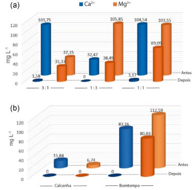 ![]() Figura 9. Concentração de Ca2+ e de Mg2+ (a) em soluções com razões 1:3, 1:1 e 1:3, e (b) em amostras de poços artesianos antes e após passagem por coluna de zeólita hierárquica