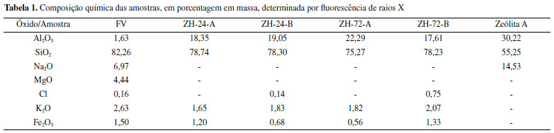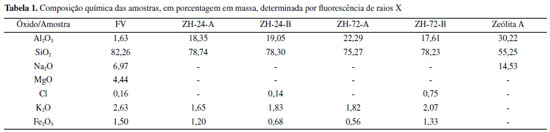 RESULTADOS E DISCUSSÃO Caracterização A seguir são apresentados e discutidos os resultados de caracterização dos materiais zeolíticos juntamente com a avaliação da aplicabilidade desses materiais no abrandamento de água por meio de processo em fluxo. As composições das amostras objeto desse estudo são mostradas na Tabela 1. Os resultados são apresentados na forma equivalente de óxidos.