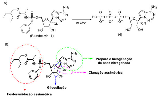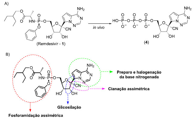![]() Esquema 1. A) Remdesivir e seu intermediário ativo; B) Principais desafios sintéticos envolvidos na síntese do Remdesivir