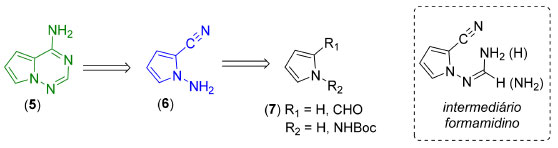 Dentre os principais desafios sintéticos envolvidos no preparo do Remdesivir (Esquema 1B), merecem destaque o preparo da base pirrolotriazina, a etapa de glicosilação desta com o derivado de carboidrato ribolactona, a cianação assimétrica e a fosforamidação assimétrica. A relativa complexidade estrutural dessa molécula, que inclui ainda a presença de seis centros esterogênicos, faz com que o custo do tratamento com esse medicamento encontre-se atualmente na casa dos milhares de dólares por paciente.20 Assim, diversos grupos de pesquisa em síntese orgânica têm desenvolvido metodologias alternativas visando a simplificação do preparo desse fármaco e, consequentemente, uma maior acessibilidade ao medicamento. Preparo e halogenação da base nitrogenada A preparação da base nitrogenada não-natural pirrolo[2,1-f][1,2,4]triazina (5) geralmente se dá a partir da ciclização, via intermediário formamidino, do 1-aminopirrol-2-carbonitrila (6), o qual, por sua vez, pode ser acessado a partir do pirrol 7 ou seus derivados. Das cinco rotas disponíveis na literatura, quatro seguem essa abordagem, ilustrada como retrossíntese no Esquema 2.