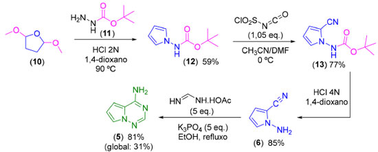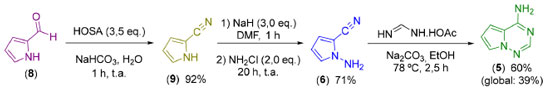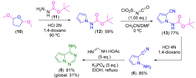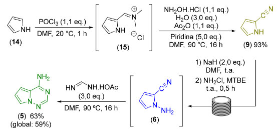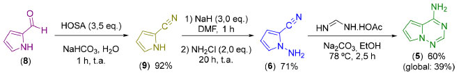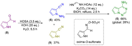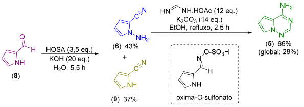 Klein e colaboradores foram os responsáveis pela primeira rota sintética de acesso à base pirrolotriazina (5), a qual foi obtida em rendimento global de 28%, em duas etapas, a partir do 2-pirrolcarboxaldeído (8) (Esquema 3).21 A proposta dos pesquisadores foi apostar na versatilidade do ácido hidroxilamina-O-sulfônico (HOSA) para promover tanto a cianação (via intermediário oxima-O-sulfonato) quanto a N-aminação de 8, em uma única etapa, na presença de KOH. No entanto, esta metodologia apresentou baixa quimiosseletividade, fornecendo o intermediário reativo 1-aminopirrol-2-carbonitrila (6) em apenas 43% de rendimento e também o produto não-aminado pirrol-2-carbonitrila (9) como um subproduto indesejado em 37% de rendimento. Por outro lado, a etapa de formação da pirrolotriazina com acetato de formamidina, embora empregue grande excesso dos reagentes, mostrou-se eficiente, em termos operacionais e de rendimento (66%). Merece destaque o tempo reacional total relativamente curto (8 h) para acesso à base nitrogenada pela rota de Klein, fornecendo o heterociclo 5 em 28% de rendimento global.