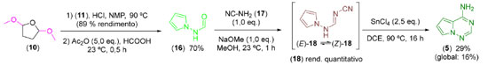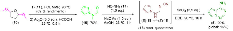 Em termos cronológicos, a quarta proposta sintética descrita na literatura para o preparo de 5 é resultado de uma colaboração entre os grupos de pesquisa de Sarpong e Garg.25 Assim como a rota da Bayer, essa estratégia utiliza 2,5-dimetoxitetra-hidrofurano (10) como material de partida de uma sequência linear de quatro etapas. Essa abordagem alternativa de acesso à nucleobase tem como etapa-chave a ciclização da cianoamidina 18, via substituição eletrofílica aromática (Esquema 6). Nesse protocolo o intermediário 18 é obtido a partir da condensação da cianamida 17 com a formamida 16 e, embora seja inovador no que se refere ao uso de intermediários alternativos, a proposta sintética leva a um rendimento global de apenas 16%.