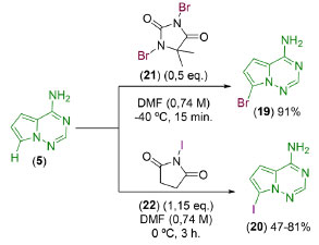 A halogenação da base nitrogenada 4-aminopirrolo[2,1-f][1,2,4]triazina também tem sido alvo de bastante interesse na literatura, uma vez que esta é uma reação chave para a etapa sintética subsequente de C-glicosilação. Nesse contexto, derivados 7-halopirrolotriazina são requeridos nas primeira e segunda gerações de síntese do Remdesivir. Enquanto a 7-bromopirrolo[2,1-f][1,2,4]triazina (19) foi utilizada na primeira geração da síntese do antiviral, na segunda geração esse derivado bromado foi substituído por 7-iodopirrolo[2,1-f][1,2,4]triazina (20), devido ao fato de o derivado iodado ser mais efetivo na troca metal-halogênio requerida nas condições reacionais empregadas para a C-glicosilação.27 As halo-substituições eletrofílicas em C-2 do núcleo pirrolotriazina são realizadas, empregando-se diferentes agentes como 1,3-dibromo-5,5-dimetilimidazolidina-2,4-diona (21) e N-iodosuccinimida (NIS) (22), em DMF, como fontes eletrofílicas de bromo e iodo, respectivamente. Os derivados halogenados são facilmente isolados do meio reacional e obtidos em rendimentos de até 91% (Esquema 8).26,28