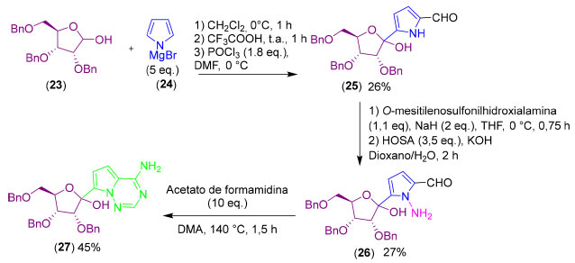 Etapa de C-glicosilação As reações de C-glicosilação são bastante exploradas na síntese de compostos com atividades biológicas.29 De maneira geral, essas reações são bastante sensíveis ao ar e à umidade, pois geralmente, envolvem adições nucleofílicas mediadas por complexos metálicos.30 Na síntese do Remdesivir a obtenção do intermediário C-glicosilado ainda é bastante desafiadora, geralmente, necessitando de temperaturas reacionais muito baixas, apresentando baixos rendimentos, intermediários instáveis, além da formação de subprodutos tóxicos. Em 1994, Klein e colaboradores reportaram pela primeira vez o preparo do (3R,4R,5R)-2-(4-aminopirrolo[2,1-f][1,2,4]triazin-7 il)-3,4-bis(benziloxi)-5-((benziloxi)metil)tetraidrofuran-2-ol (27), que é intermediário-chave obtido por meio de um processo de C-glicosilação e utilizado no preparo do Remdesivir (Esquema 9).31 A estratégia de síntese se iniciou com um acoplamento do tipo Grignard entre o carboidrato 23 e o brometo de magnésio pirrol 24. Nessa abordagem, observou-se uma mistura de produtos C- e N-glicosilados, resultando em uma baixa seletividade para a reação. Na sequência, a construção do núcleo pirrolo[2,1-f][1,2,4]triazin-4-amina foi realizada de maneira análoga à já descrita anteriormente pelo mesmo grupo de pesquisa.21 Nesse protocolo sintético, o intermediário 27 foi obtido em apenas 3% de rendimento global utilizando 3 etapas, sendo duas delas one-pot, já que muitos dos intermediários formados sofriam degradação durante o processo de purificação.