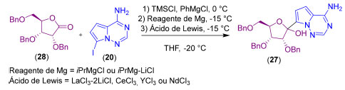Em 2012, um grupo de pesquisadores, publicaram uma inovação na síntese do produto 27.35 Nessa proposta foi avaliada a utilização do grupo protetor 1,2-bis-(clorodimetilsilil)etano (Tabela 1 - entrada 3), levando a uma melhora considerável no rendimento (60%) quando comparado às outras metodologias descritas ou à reação na ausência de grupo protetor (Tabela 1 - entrada 2). Alguns anos depois, uma nova patente depositada pela Gilead Sciences forneceu inovações em várias etapas da síntese do Remdesivir. No que tange à etapa de glicosilação utilizou-se a base iodada 20 e a lactona 28 na presença de cloreto de isopropilmagnésio (iPrMgCl) associado a ácidos de Lewis ou na presença de um complexo de acoplamento baseado em magnésio-lítio (cloreto de iso-propil magnésio-lítio) (Esquema 10).36 Com essas modificações foi possível realizar a síntese em temperaturas mais amenas (entre 0 e-20 °C), evitando temperaturas extremas de-78 °C. Merece destaque também a possibilidade de uso de uma diversidade de ácidos de Lewis para realizar essa transformação, como LaCl3-2LiCl, CeCl3, YCl3 e NdCl3.