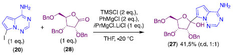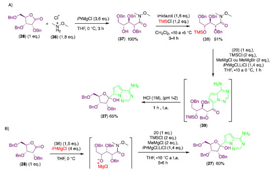Em sistema de batelada, a velocidade de adição do n-BuLi é mandatória para reprodutibilidade do rendimento, uma vez que pode levar à transferência inadequada de calor em microambientes isolados (uma vez que a reação é exotérmica). Nesse estudo, demonstrou-se que um sistema de fluxo é capaz de atenuar esse tipo de problema, evitando a decomposição do intermediário litiado desejado. Além disso, o organolítio empregado precisa ter um alto caráter nucleofílico de maneira a evitar a abstração do hidrogênio ácido da lactona e favorecer de fato a C-glicosilação. No mesmo ano, Shen e colaboradores descreveram uma nova metodologia para C-glicosilação capaz de minimizar a formação de subprodutos.41 A estratégia desse estudo consistiu no emprego de uma amida de Weinreb como intermediário-chave, evitando a possibilidade de dupla adição da base 27 ao derivado da ribose 28. Foram descritas duas propostas: a primeira em 4 etapas fornecendo o produto 27 em 65% de rendimento (Esquema 15A) e a segunda em apenas 2 etapas, bastante promissora (60% de rendimento), mas que necessita de tempos reacionais mais longos (Esquema 15B). As principais vantagens dessas propostas consistem na possibilidade de purificação do produto desejado através de recristalização em metil terc-butil éter (MTBE) e na substituição do PhMgCl por MeMgBr, evitando a formação de benzeno como subproduto.
