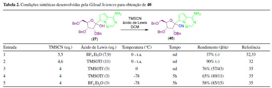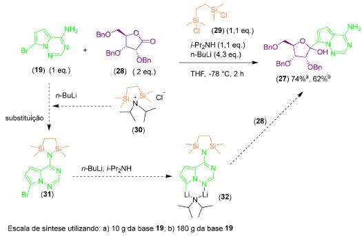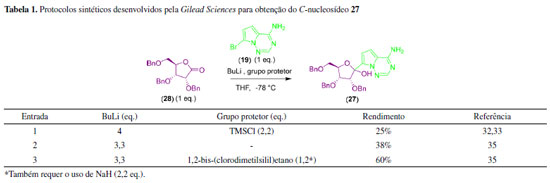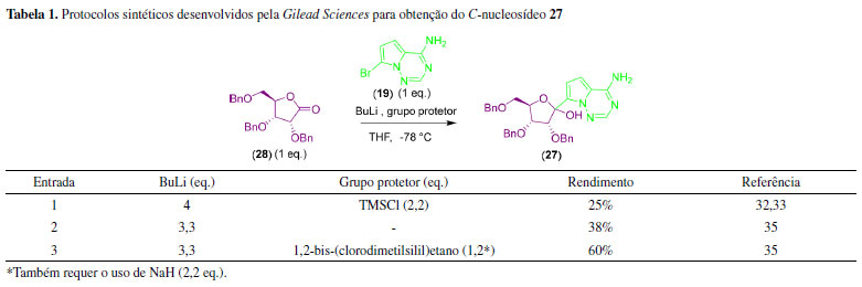 Recentemente, a empresa Gilead Sciences reivindicou, por meio de patentes, algumas metodologias para a obtenção do intermediário 27 (Tabela 1).32-34 A metodologia para a formação desse produto partiu da base bromada 19 e da lactona derivada da ribose 28, utilizando-se ainda TMSCl como grupo protetor da amina e BuLi como agente de acoplamento. Nesse protocolo, foi necessária a utilização de baixas temperaturas (-78 °C) e foi possível obter um rendimento baixo (25%) da mistura de anômeros de 27 (Tabela 1 - entrada 1).