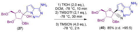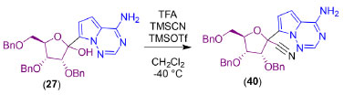 Embora várias modificações na etapa de C-glicosilação tenham sido propostas recentemente, possibilitando uma considerável melhora na eficiência das reações e na minimização da formação subprodutos, a maioria das metodologias ainda utiliza reagentes bastante sensíveis e que requerem um tratamento anidro, temperaturas baixas, necessidade de manipulação de grupos protetores que podem contribuir com dificuldades operacionais e também no aumento no custo do processo como um todo. Etapa de cianação As reações de cianação constituem uma importante e desafiadora etapa durante a síntese do Remdesivir, necessitando de cuidados devido à elevada toxicidade do cianeto de hidrogênio, que pode ser utilizado diretamente ou gerado in situ a partir de outros reagentes como TMSCN, cianoformato de etila, cianato de acetila e acetona de cianoidrina.42 Essas reações podem ser divididas em duas categorias: a adição nucleofílica a compostos polarizados, ou cianação conjugada em carbonilas α,β-insaturadas.43 Na síntese do Remdesivir, o intermediário de cianação 40 geralmente é planejado segundo a primeira categoria, normalmente utilizando o TMSCN como fonte de grupo ciano. Nessas reações já foram avaliados diversos ácidos de Lewis como catalisadores, várias faixas de temperatura, equivalência de reagentes e ordem de adição e todos esses quesitos se mostraram bastante importantes na eficiência da reação. Recentemente, a empresa Gilead Sciences reivindicou através de uma série de patentes, metodologias para vários intermediários avançados do Remdesivir, incluindo a obtenção do produto de cianação 40 através do tratamento do composto 27 com um doador de grupo ciano (TMSCN) em diclorometano.32-34 Para esse protocolo, foram avaliados como catalisadores dois ácidos de Lewis: o BF3-Et2O e o TMSOTf (Tabela 2 - Entradas 1 e 2), fornecendo rendimentos de 37% e de 90%, respectivamente. Merece destaque como principal problema nesses protocolos o uso de grande excesso dos agentes de cianação.