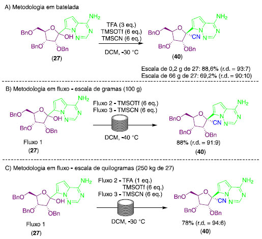 Em 2020, Heumann e colaboradores utilizaram a química em fluxo contínuo como estratégia tecnológica para a obtenção do produto de cianação 40.44 Utilizando o ácido trifluoracético como ácido de Brønsted e uma temperatura reacional mais amena (-30 °C), foi possível o acesso ao produto desejado em bons rendimentos e diasterosseletividades (88,6% e 93:7 r.d., respectivamente) (Esquema 18A). No entanto, o aumento da escala de reação em 330 vezes levou a uma considerável queda no rendimento (69,2%).