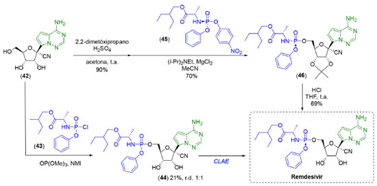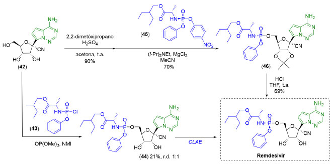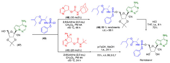 Na sequência, o processo em fluxo contínuo foi avaliado visando a evitar a exposição dos reagentes a tempos prolongados de reação e impedir a decomposição dos reagentes de partida. No sistema de fluxo, a reação foi conduzida com sucesso em uma escala de até 100 gramas, não sendo necessário, neste caso, o uso de TFA (Esquema 18B), o que foi atribuído à formação in situ de TfOH pela hidrólise do TMSOTf por traços de água. Contudo, esse efeito não se manteve significativo em um novo escalonamento para 250 kg de 27 (Esquema 18C), sendo necessária a reintrodução do TFA e uma sutil alteração na temperatura (-40 °C), resultando no produto desejado 40 em 78% de rendimento e 94:6 r.d. No geral, embora a etapa de cianação do intermediário do Remdesivir já tenha recebido inúmeras modificações metodológicas, com consideráveis melhorias especialmente no que diz respeito à eficiência da reação, ainda há a necessidade de uso de ácidos fortes, de uso de grande excesso dos reagentes envolvidos na cianação e de temperaturas reacionais consideravelmente baixas. Etapa de fosforamidação assimétrica Além das frações descritas até aqui, uma última porção fundamental na estrutura do Remdesivir é o grupo da fração fosforoamidato quiral contendo uma cadeira lateral derivada do éster 2-etilbutílico do aminoácido L-alanina. Recentemente, novas estratégias foram descritas para a etapa de fosforamidação assimétrica da unidade nucleosídica. Na primeira geração de síntese descrita pela Gilead Sciences, a etapa de fosforamidação se dá entre uma mistura diastereoisomérica do cloridrato de fosforoamidoíla 43 e a unidade nucleosídica desprotegida 42, na presença de N-metilimidazol (NMI) e fosfato de trimetila anidro, fornecendo a mistura diastereoisomérica 44 contendo o Remdesivir e seu estereoisomero (r.d. 1:1) em apenas 21% de rendimento, sendo ainda necessária sua posterior purificação por cromatografia líquida de alta eficiência (CLAE) (Esquema 19).27